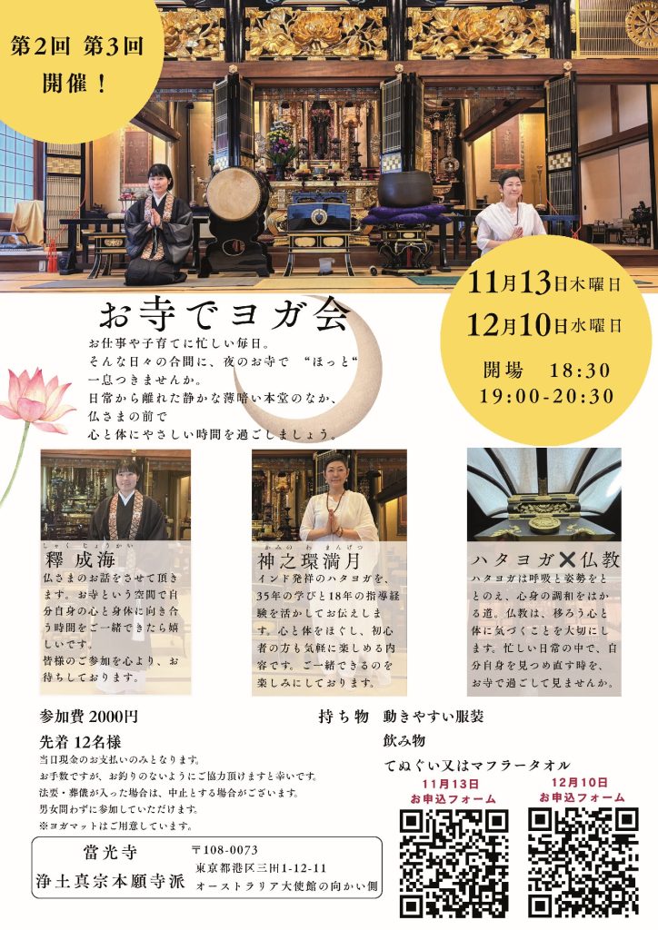 「お仕事や子育てに忙しい毎日、そんな日々の合間に夜のお寺で”ほっと”一息つきませんか。日常から離れた静かな薄暗い本堂のなか、仏さまのまえで心と体に優しい時間を過ごしましょう。」