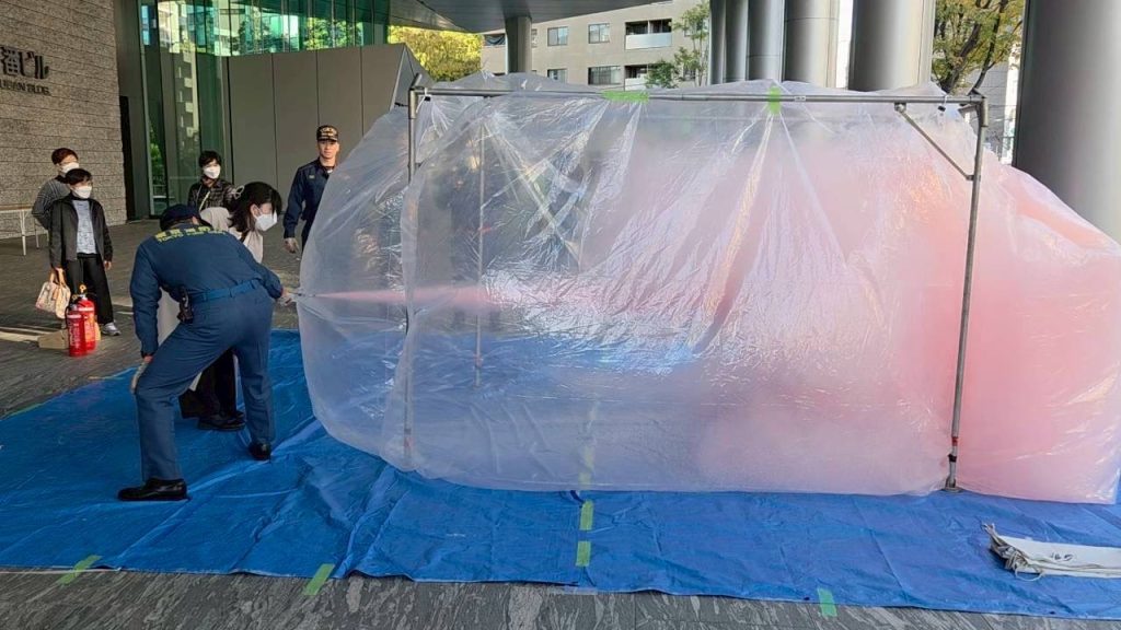本物の消火器はどのくらいの力で噴出するのか試してみました。実際に出続けるのは十数秒といわれています。火元に近づきピンを抜きホースを構えて、レバーをぐっと握って噴射します。ピンク色の粉が出ます。