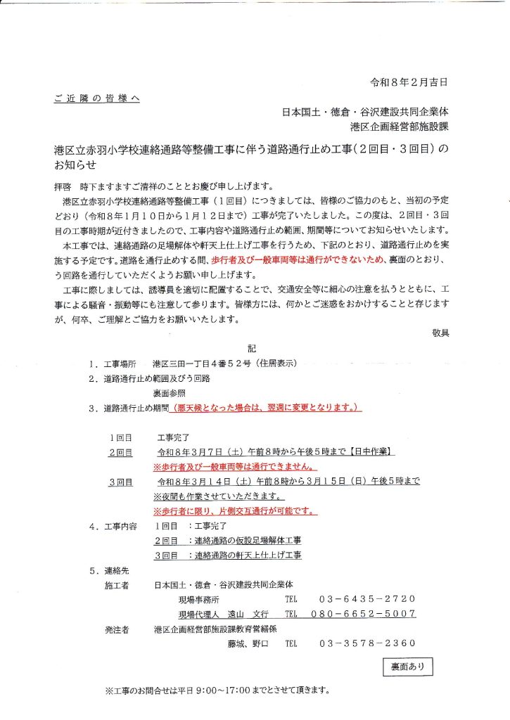 港 区立赤 羽小 学校 連絡 通 路 等整備 工事 に伴 う道路 通 行 止 め工事 (2回 目・ 3回 目)の港区からのお知らせ